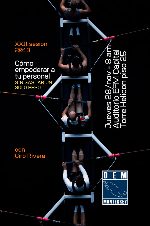 Ciro es Socio DEM Monterrey. En esta conferencia nos presenta una clarísima y muy divertida conferencia donde nos regala tips muy útiles y viables para empoderar al personal y nuestros compañeros de trabajo para darles armas de trabajo, sin invertir más dinero, con temas como el «lenguaje del aprecio», «tiempo de calidad», «actos de servicio», «regalos».