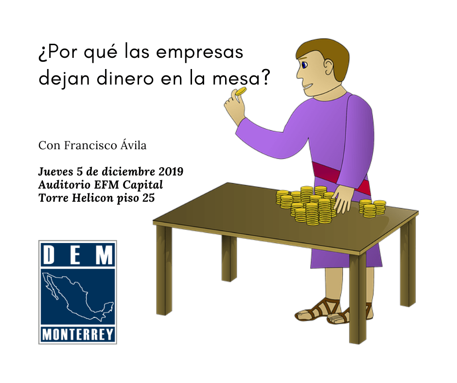 Francisco Ávila Spota, economista y amplio conocedor de por qué los productos cuestan lo que cuestan, comparte esta charla para socios DEM Monterrey y hace un profundo análisis de precios, costos, valor, revenue managment y más conceptos que nos abren la visión de los errores comunes que llevan a una empresa a dejar dinero sobre la mesa.
